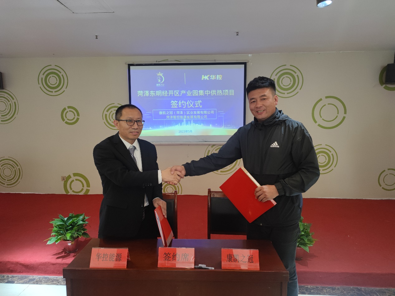 2023年5月6日下午,青島華控能源科技有限公司旗下菏澤智控能源發展有限公司與康凱之冠(菏澤)實業發展有限公司在菏澤市舉行了菏澤東明經開區集中供熱項目簽約儀式。